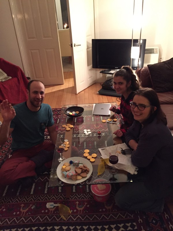 Playing dreidel for chocolate gelt